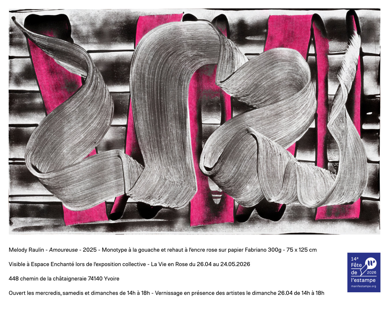 Légende de l'œuvre : Amoureuse - 2025 - monotype à la gouache et rehaut à l'encre rose sur papier Fabriano 300g - 75 x 125 cm.