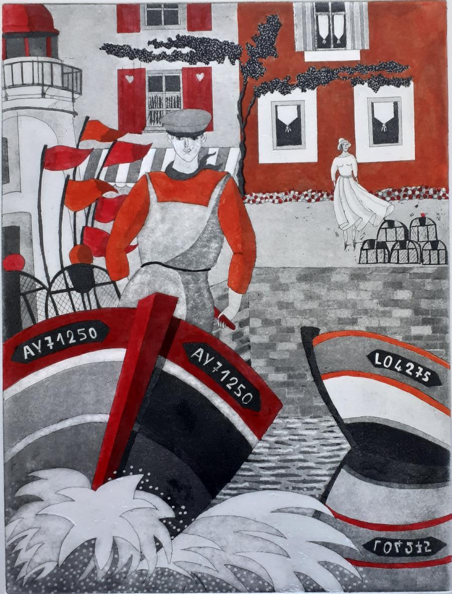 À côté de deux huiles sur toile, exposition de la gravure "Départ en pêche", 55 x 45 cm de Sophie Sirot.