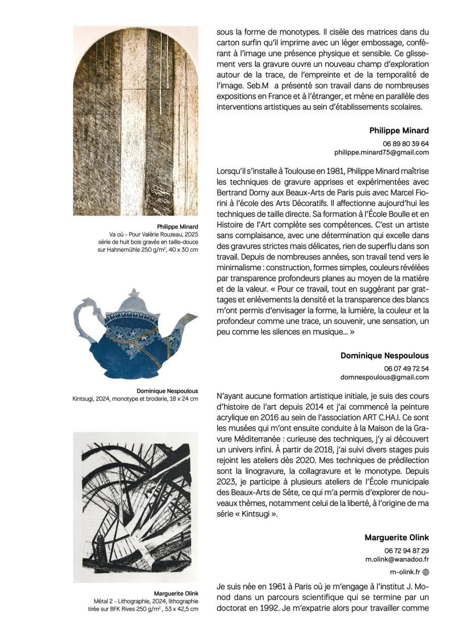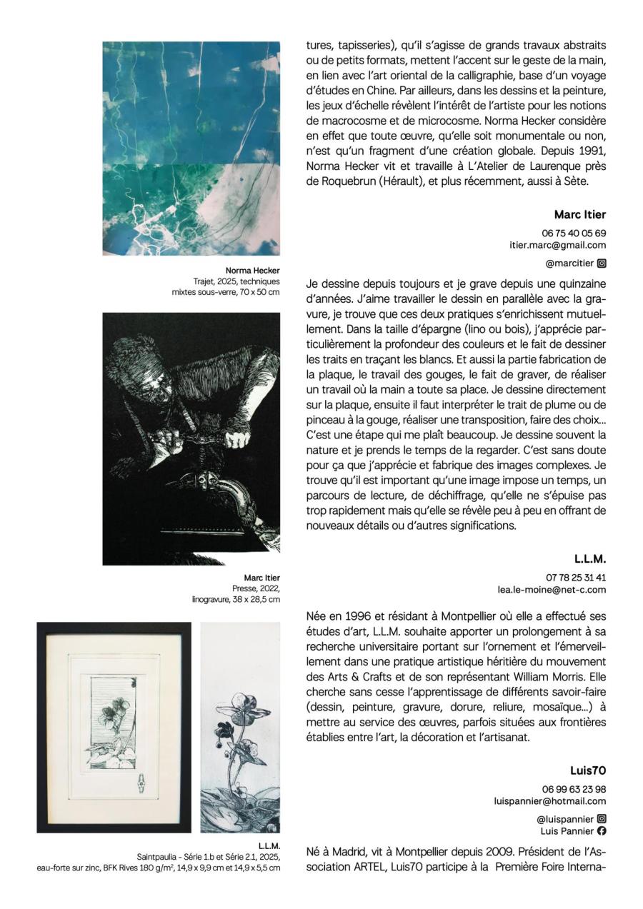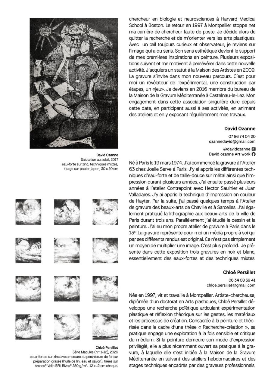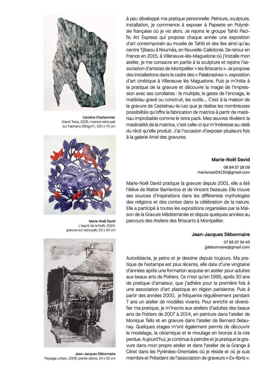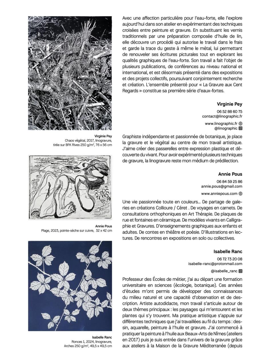 Majoritairement implantés dans le bassin montpelliérain et dans ses alentours, mais également rejoints par des artistes toulousains, pamiérois ou encore cérétans, les graveurs réunis dans cette exposition partagent, par la qualité plastique de leurs œuvres et la diversité de leurs parcours, un engagement commun : faire dialoguer les pratiques et susciter les rencontres autour de l’estampe.