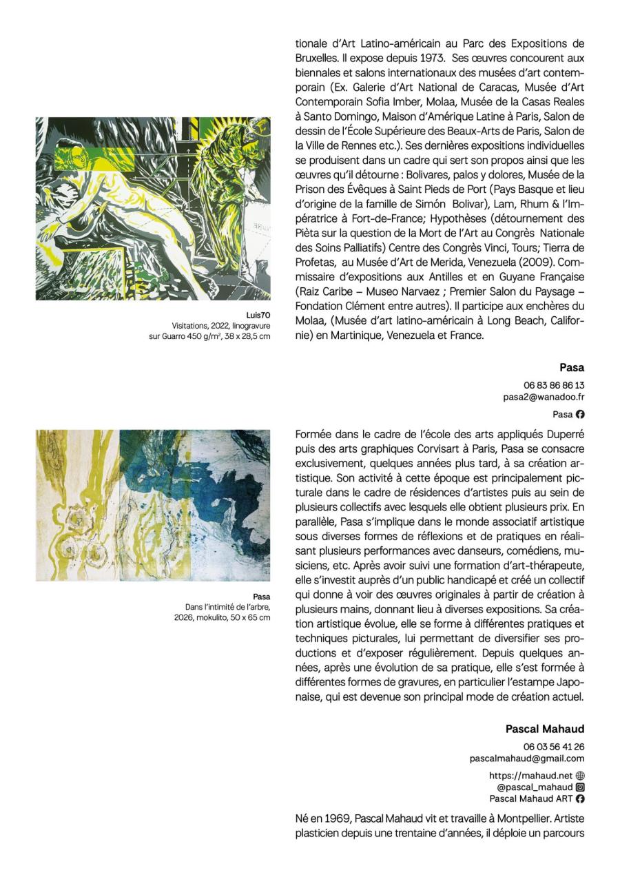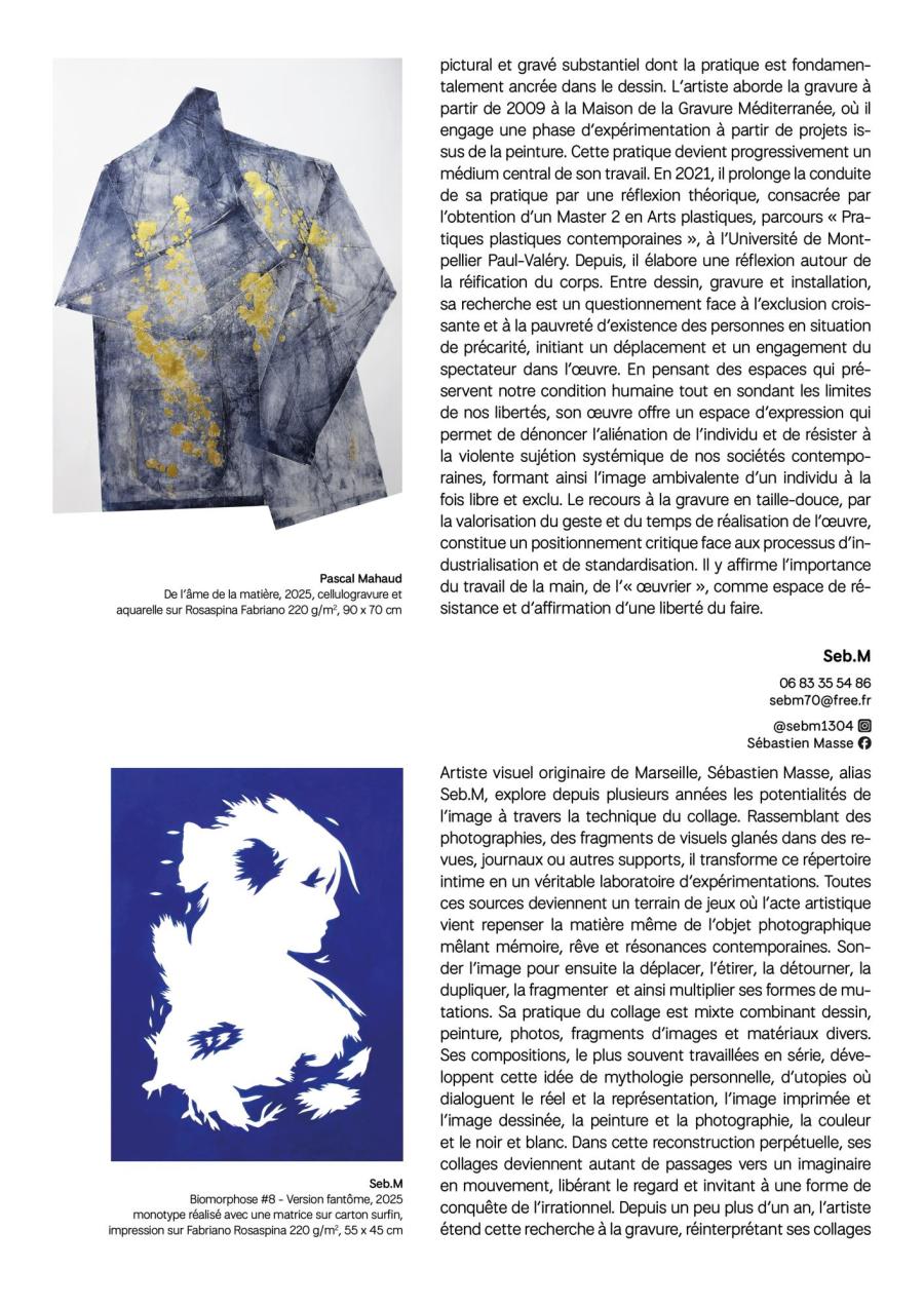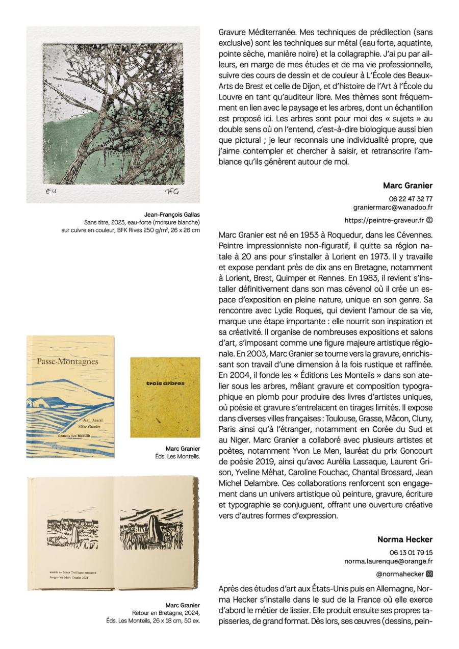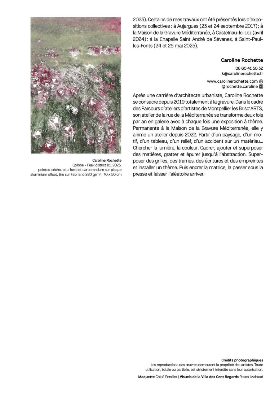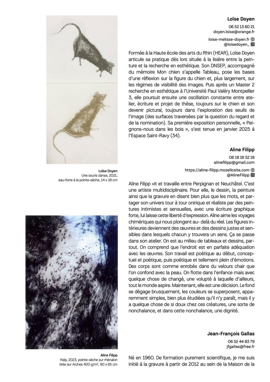Majoritairement implantés dans le bassin montpelliérain et dans ses alentours, mais également rejoints par des artistes toulousains, pamiérois ou encore cérétans, les graveurs réunis dans cette exposition partagent, par la qualité plastique de leurs œuvres et la diversité de leurs parcours, un engagement commun : faire dialoguer les pratiques et susciter les rencontres autour de l’estampe.