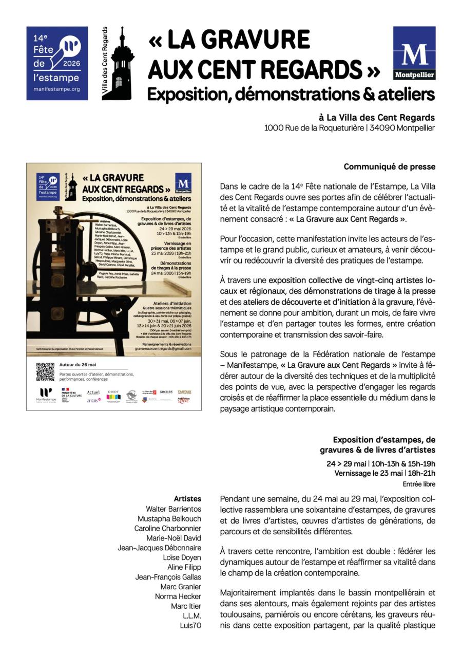 Du 24 au 29 mai 2026, à travers une exposition collective de vingt‑cinq artistes locaux et régionaux, « La Gravure aux Cent Regards » présentera une soixantaine d’estampes, de gravures et de livres d’artistes, œuvres de peintres et graveurs de générations, de parcours et de sensibilités différentes.