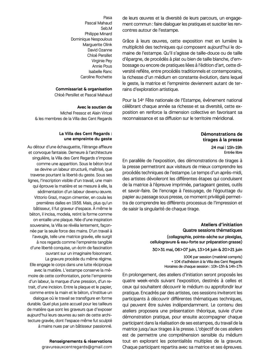 Pour la 14e Fête de l’Estampe, évènement national célébrant chaque année sa richesse et sa diversité, cette exposition en renforce la dimension collective en favorisant sa reconnaissance et sa diffusion sur le territoire méridional.