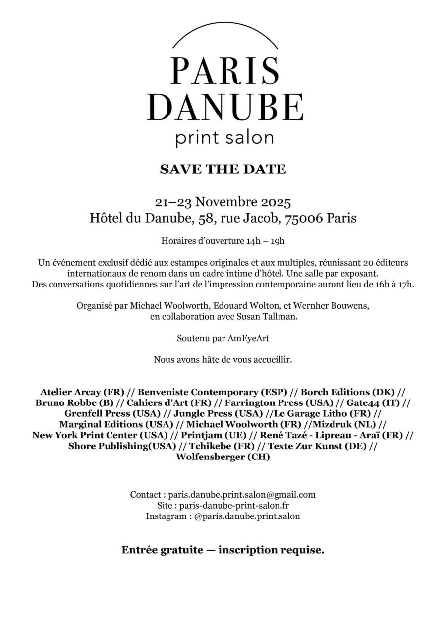 Vous êtes invités à venir rencontrer 20 ateliers et éditeurs internationaux de premier plan dans le sublime hôtel du Danube au cœur de Saint-Germain-des-Prés à Paris.