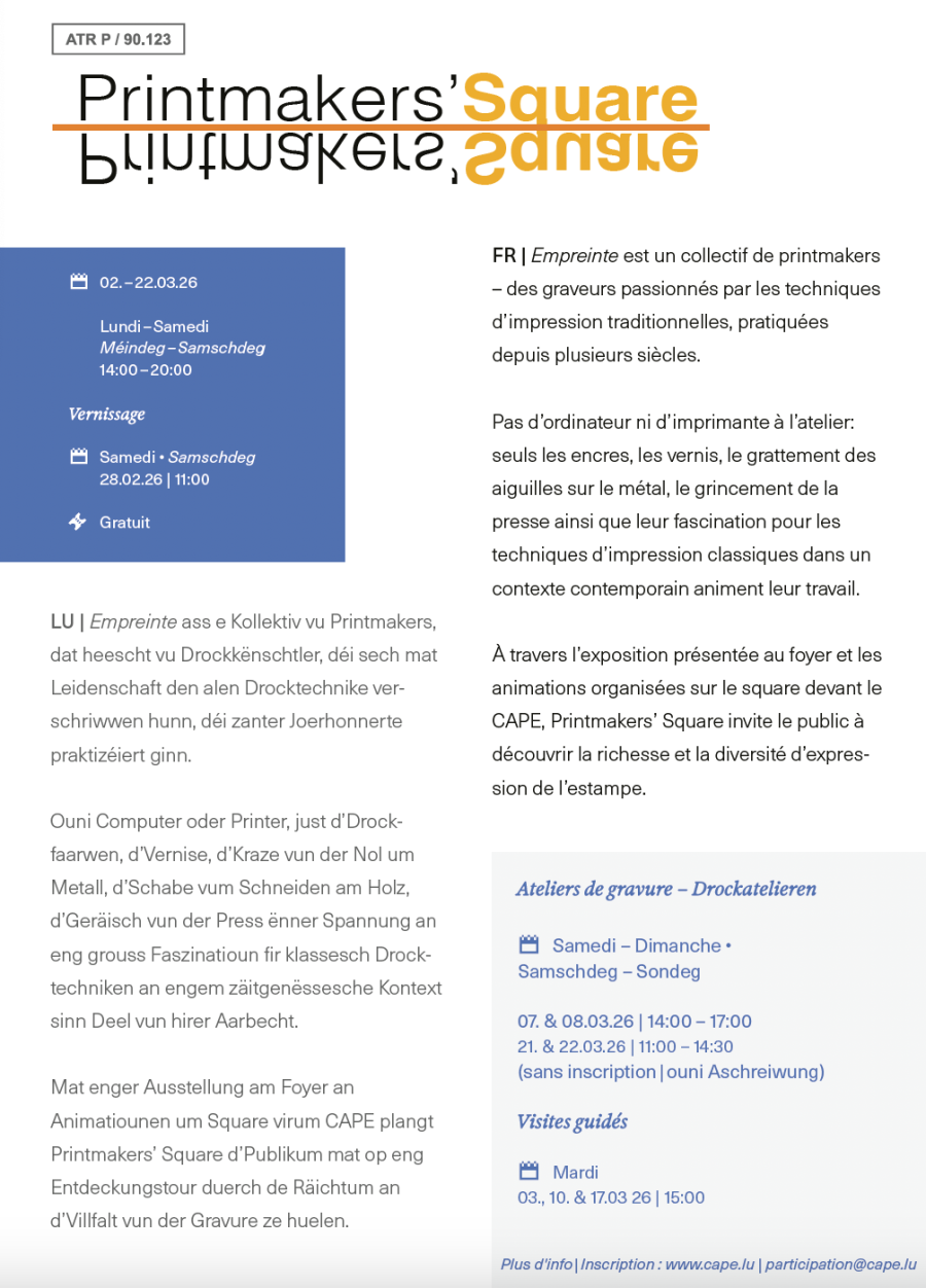 Empreinte vous accueillera avec plaisir lors de sa nouvelle exposition "Printmakers' Square" au Centre des Arts Pluriels à Ettelbruck!
