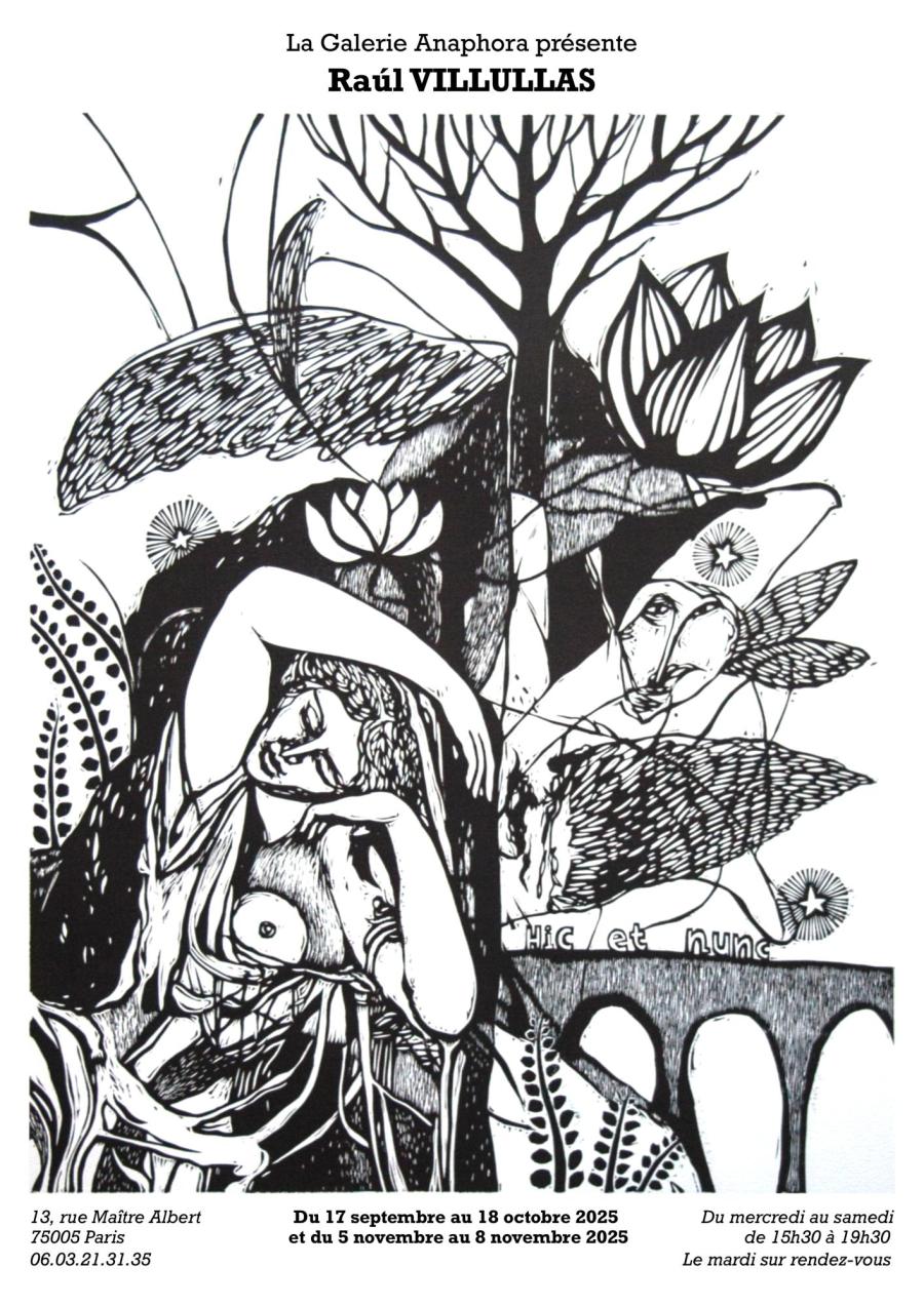 L’exposition personnelle de Raūl Villullas est la 49e exposition de la Galerie Anaphora et la première exposition personnelle. Cette exposition rétrospective rassemble des oeuvres sur une douzaine d’années, à partir de 2013. Il s’agit avant tout de gravures sur bois, de quelques peintures (acrylique sur papier) choisies parce qu’elles sont à l’origine d’un bois, de rares pointes sèches sur rhénalon et de petites aquatintes.