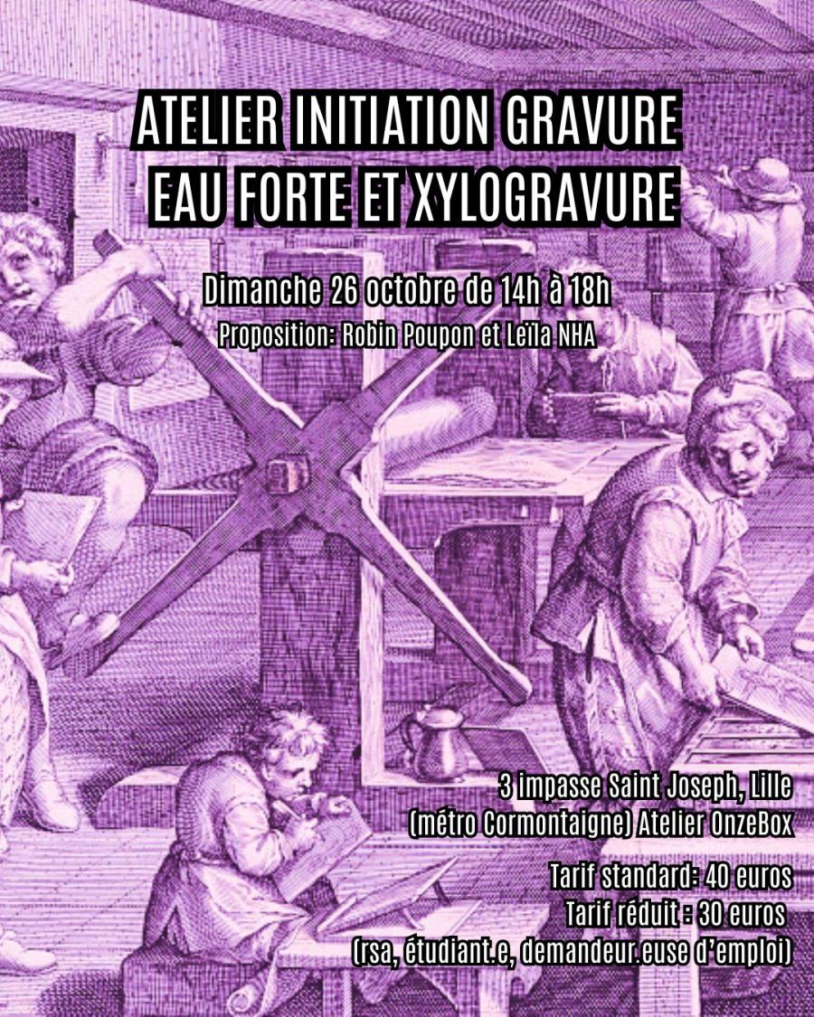 L'atelier d'initiation à l'eau-forte et à la xylogravure sera l'occasion de se familiariser avec ces techniques de gravure. L'atelier sera également l'occasion d'explorer l'image en double impressions, et d'expérimenter différents types de papiers, afin de jouer sur les effets de transparences et de superpositions.