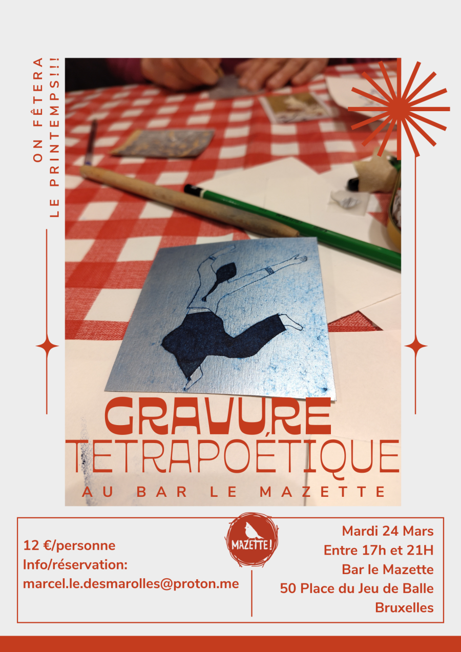 Ce sera le mardi 24 mars, entre 17h et 21h, au bar mazette, 50 place du jeu de balle, Bruxelles