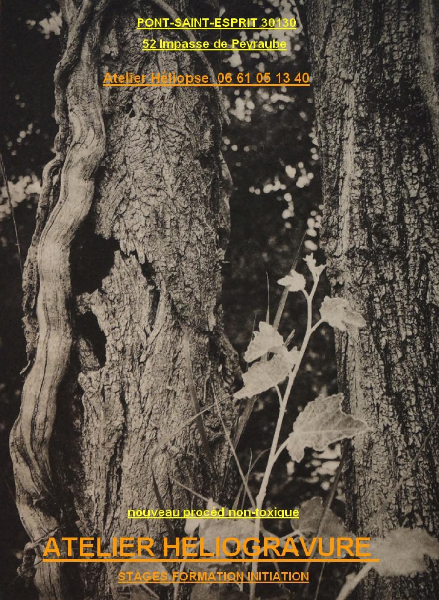 Ce stage de 2 ou 3 journées consécutives à l'atelier propose d'acquérir les bases nécessaires à l'utilisation d'un nouveau procédé non toxique dans le domaine de l'héliogravure. En effet, cette technique patrimoniale issue des débuts de la photographie était arrivée dans une impasse, car elle mettait en oeuvre un produit hautement toxique pour la santé (sels de chrome), mais aussi pour l'environnement. J'ai développé dans mon atelier l'utilisation d'un produit non-toxique, utilisé dans l'alimentation. Cette formation est ouverte à tous : graveurs, photographes, artistes plasticiens... Au delà du stage, un service de suivi est maintenu en direct à la demande.