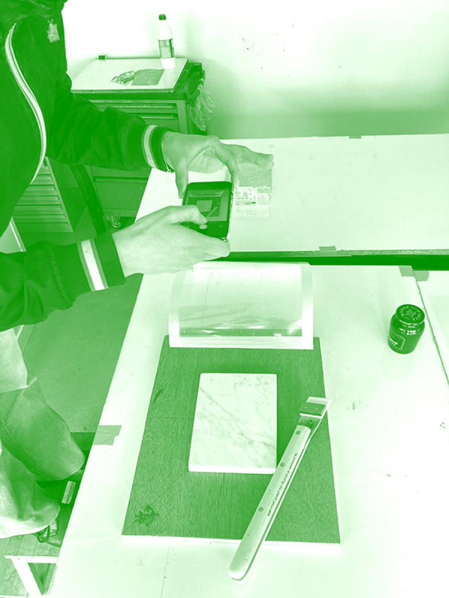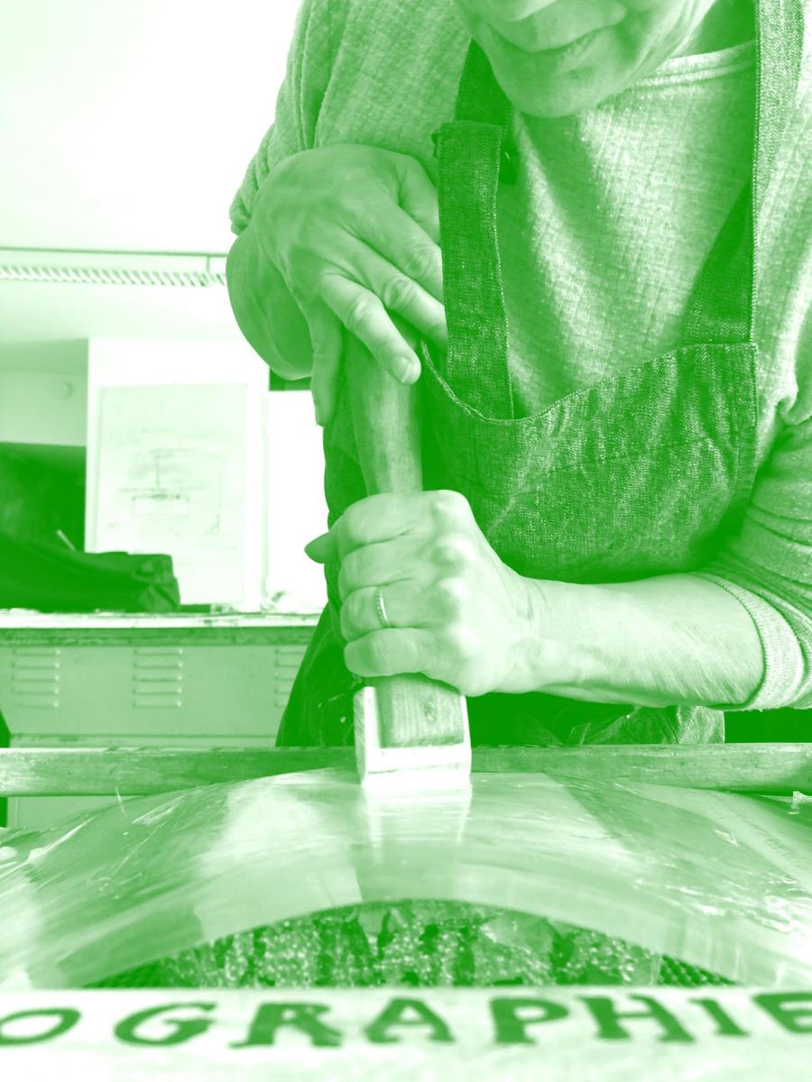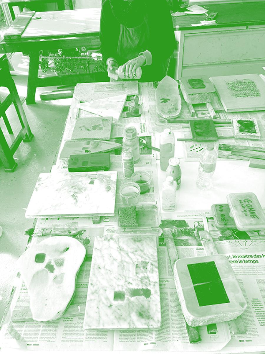Le premier jours pour reprendre les fondamentaux de la lithographie : expérimenter différents matériaux, produits, outils, gestes et postures. S’ouvrir de nouvelles perspectives plastiques et pourquoi pas éditoriales, en utilisant différentes presses et pierres : bête à corne, presses à poing, calcaires sédimentaires et métamorphiques.