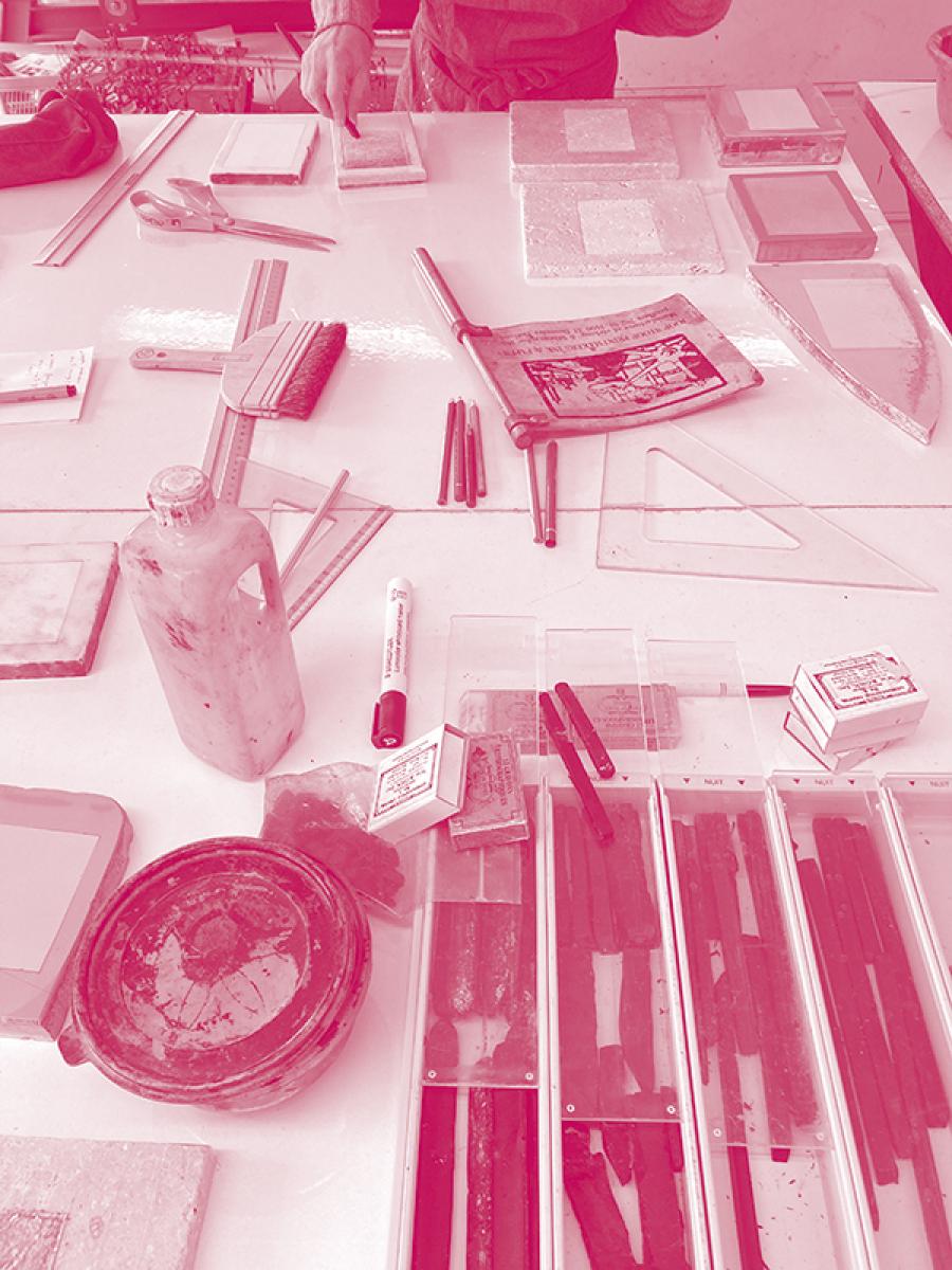 Elle permet de savoir fabriquer, associer les fibres végétales pour absorber, retenir, nuancer les matières grasses et les couleurs imprimées, structurer et construire avec cette matière graphique en trois dimensions : multipliant sa lecture. Les stagiaires apprennent à créer le support, la surface et le volume d’œuvres graphiques uniques. En jouant sur les textures, les épaisseurs, les couleurs, les faces et facettes les stagiaires obtiennent des « architectures » aux capacités plastiques variées et singulières..