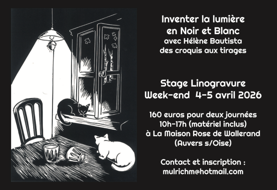 Après le succés du premier stage de linogravure en février, Hélène Bautista nous fait le plaisir d'organiser un nouveau stage les 4 et 5 avril.