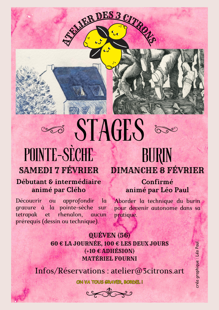 Samedi 7 février, 10h-17h, pointe sèche sur différents supports au choix, pour un public débutant ou pratiquant déjà la gravure, avec Clého.