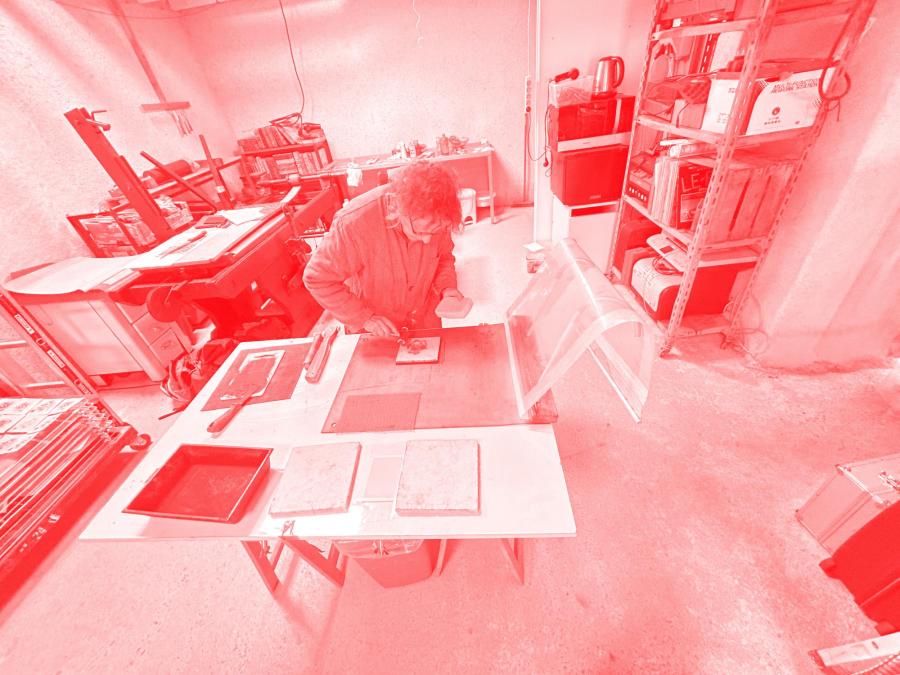 Le stage se déroule dans l’atelier Taller Lorem Ipsum à Roc’hCreiz au sud de Morlaix (Finistère) avec le matériel spécialisé d’impression du petit jaunais.