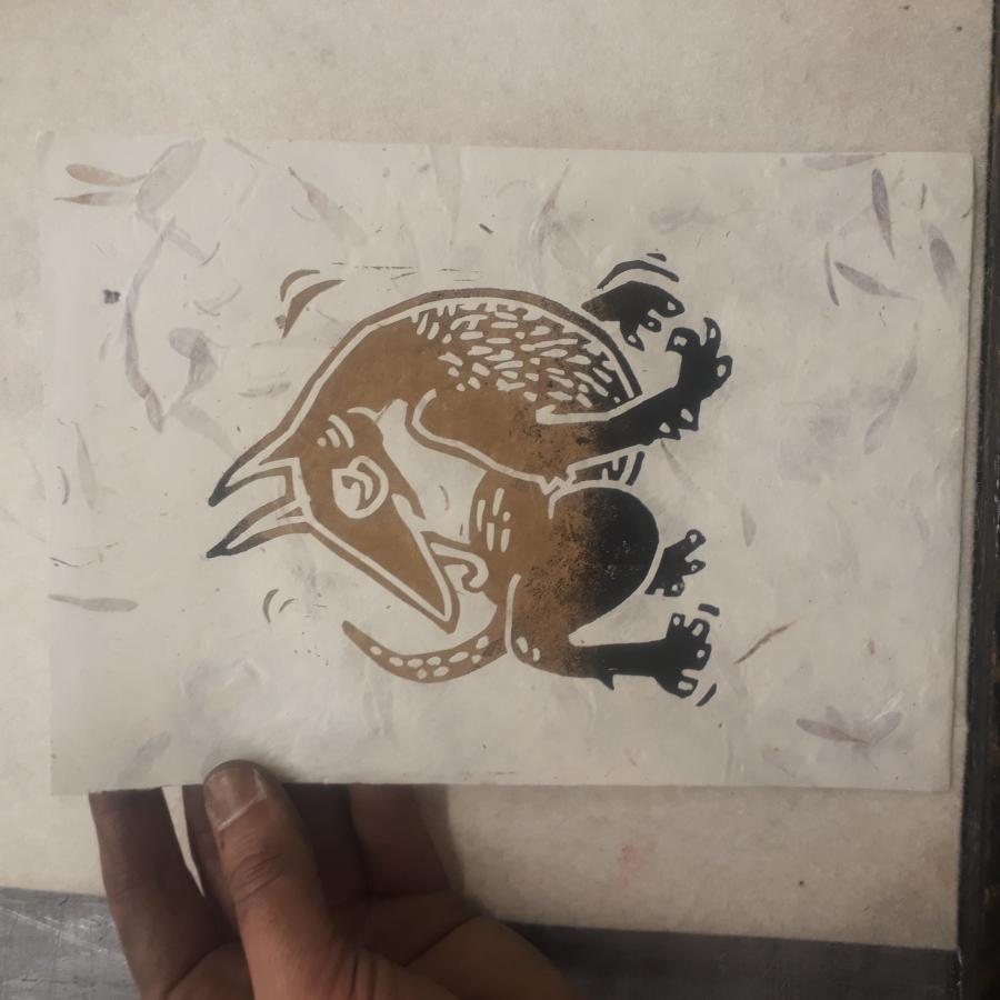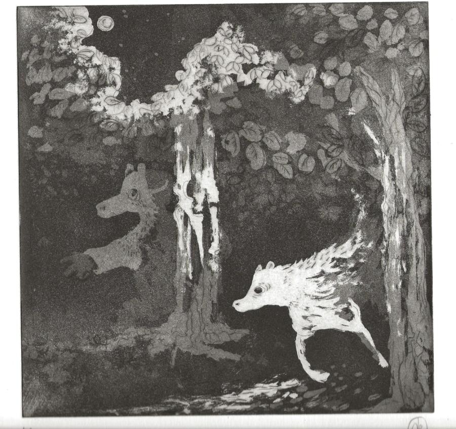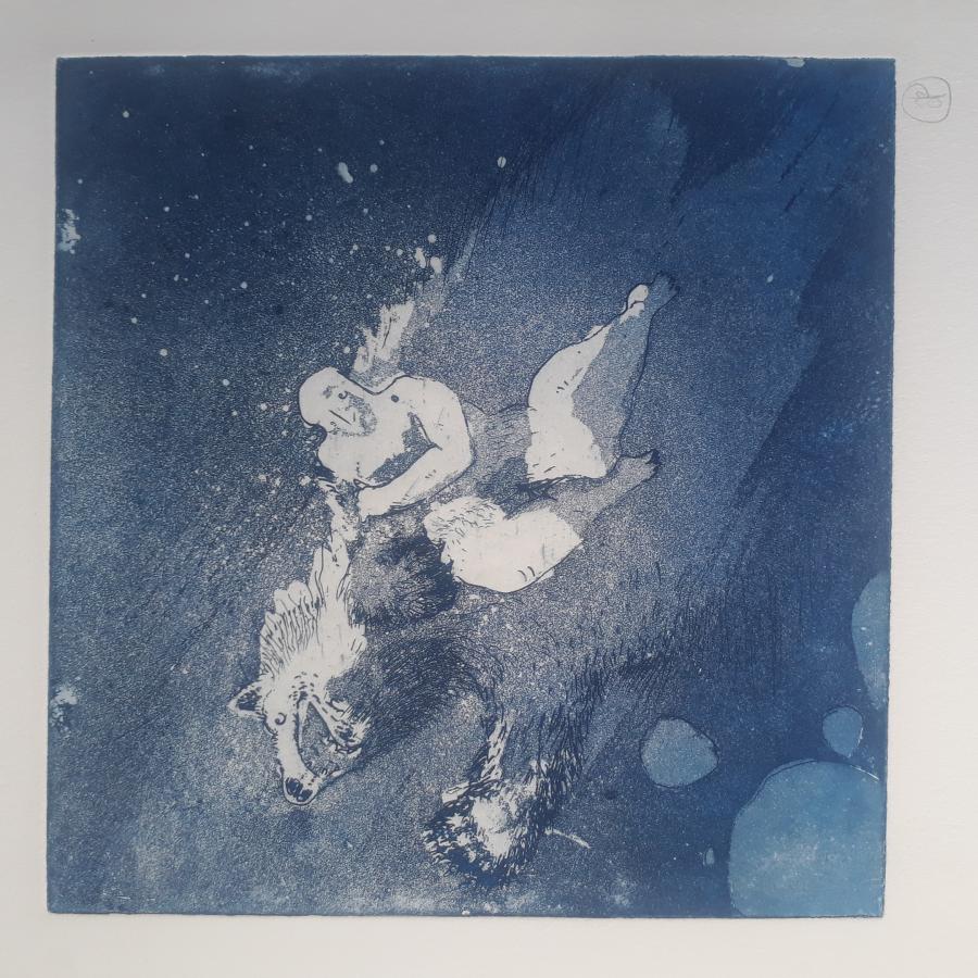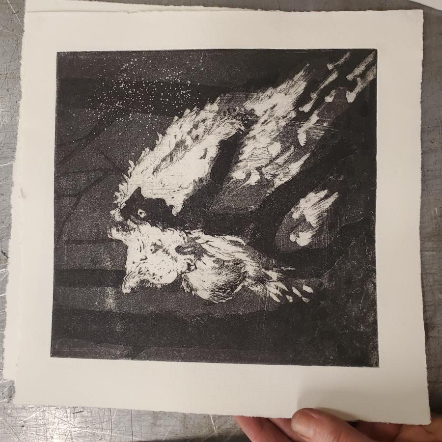 Lino et bois : encore des chien-loups et des oiseaux-chaussette, cette fois-ci en devant prévoir un peu plus ce que je vais faire. Il s'agit souvent de personnages issus des eaux-fortes.