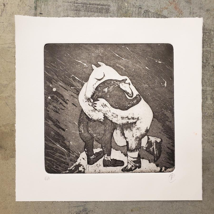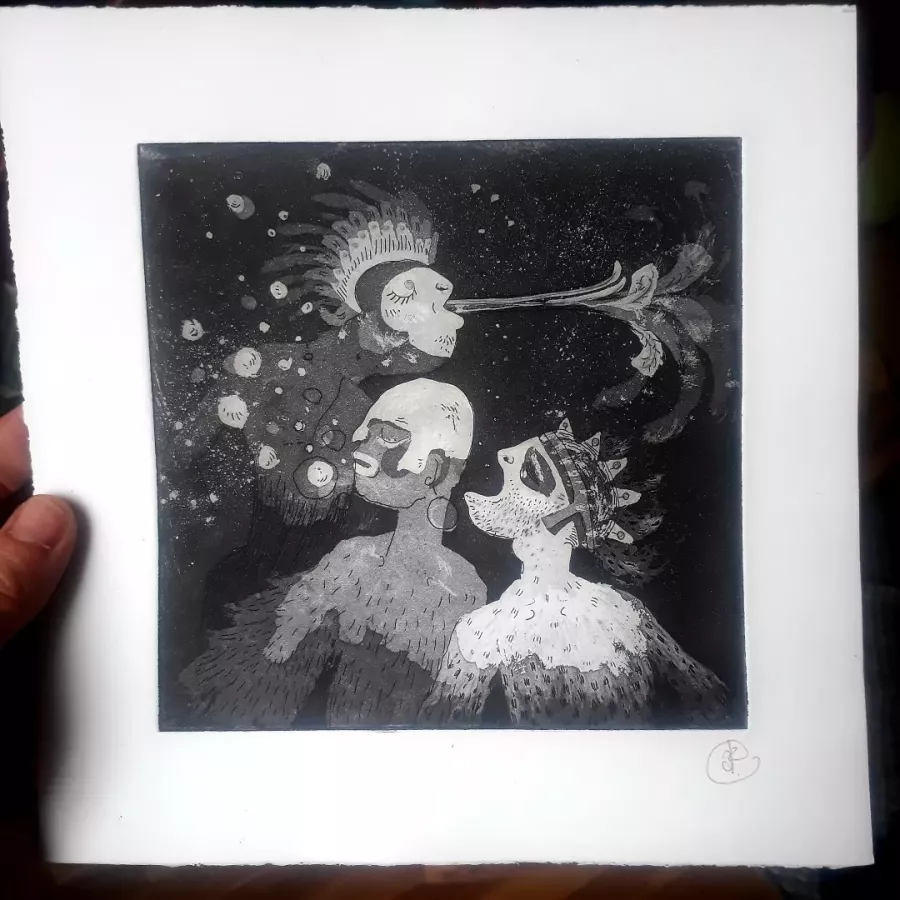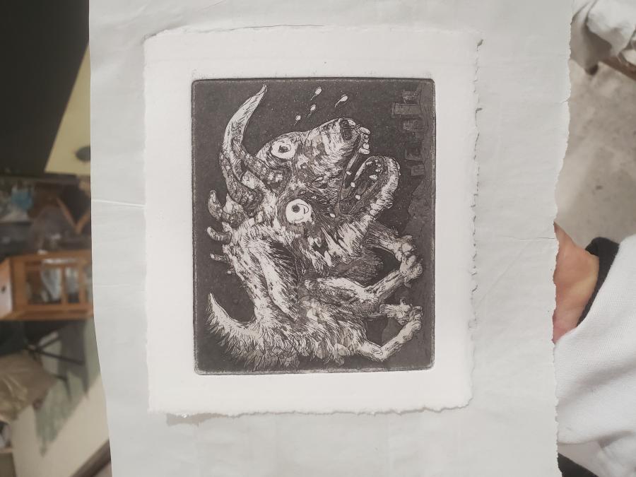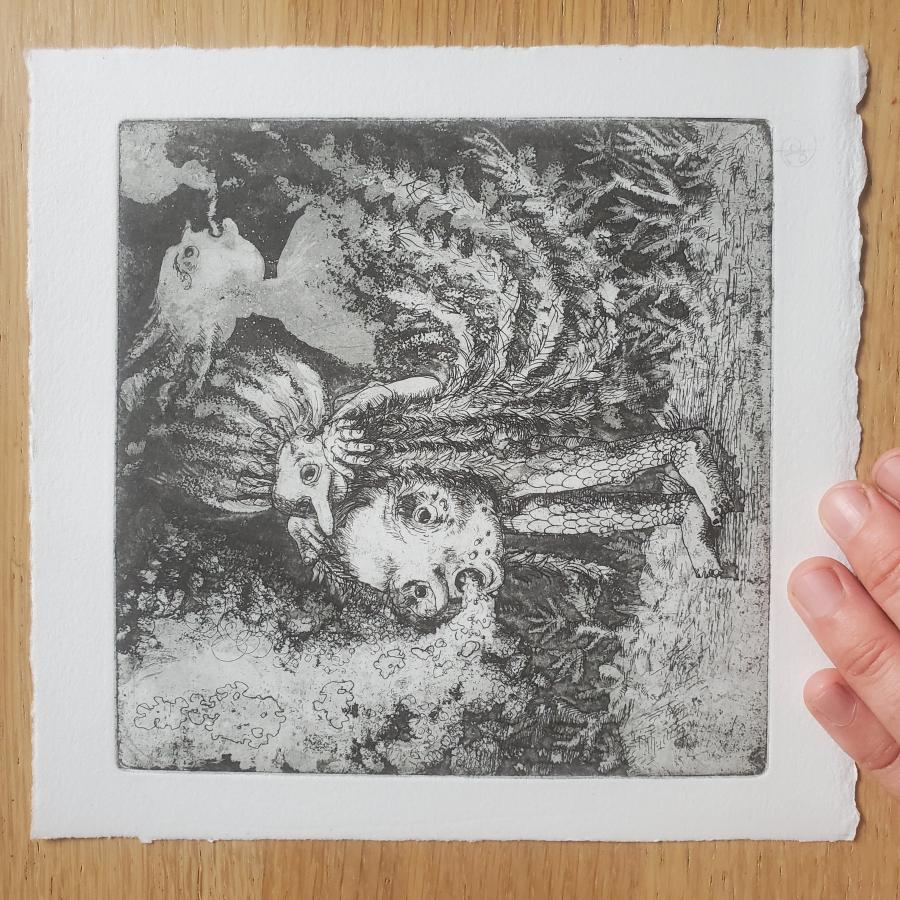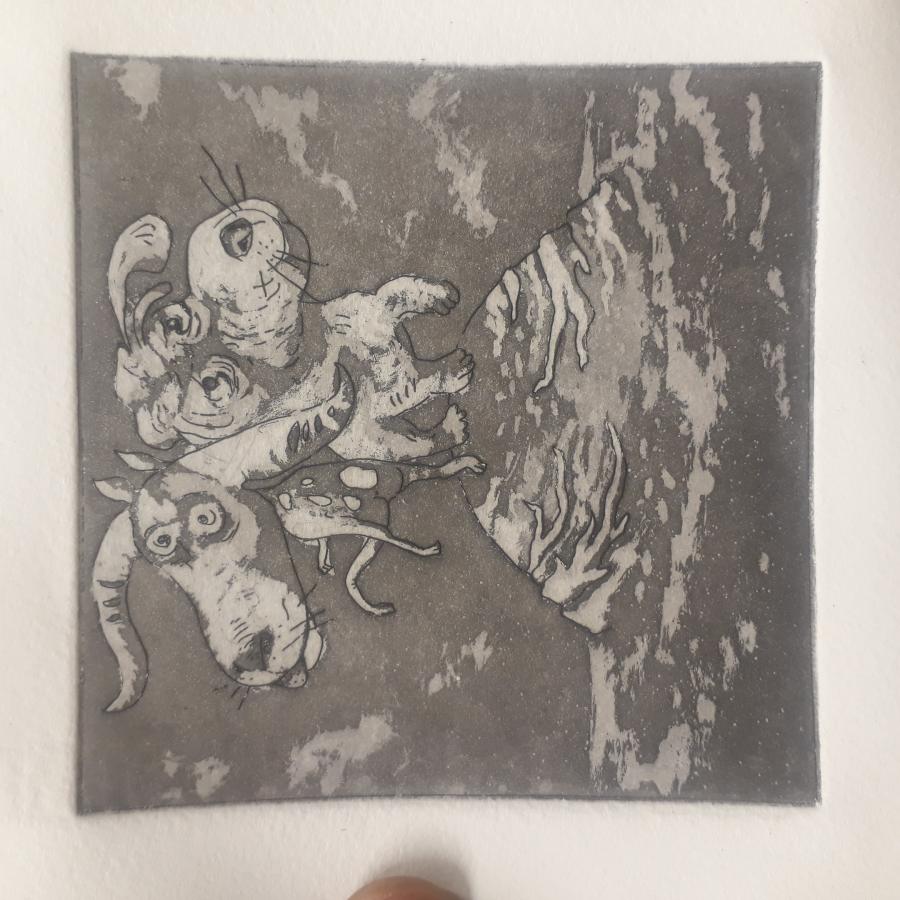 Zinc et cuivre : au premier passage de vernis sur la plaque entière, je m'arrange pour créer des irrégularités. Puis, la pointe sèche en main et probablement en louchant un peu, je vois, dans les reflets et bavures du vernis, des formes, comme lorsqu'on regarde les nuages. C'est une espèce de méthode du chaos qui m'évite la page blanche, et convoque invariablement un monde bancal, ce troupeau de bêtes mélancoliques sur le point de faire une blague de prout. J'ai décidé de les laisser faire, tant pis pour l'étiquette.