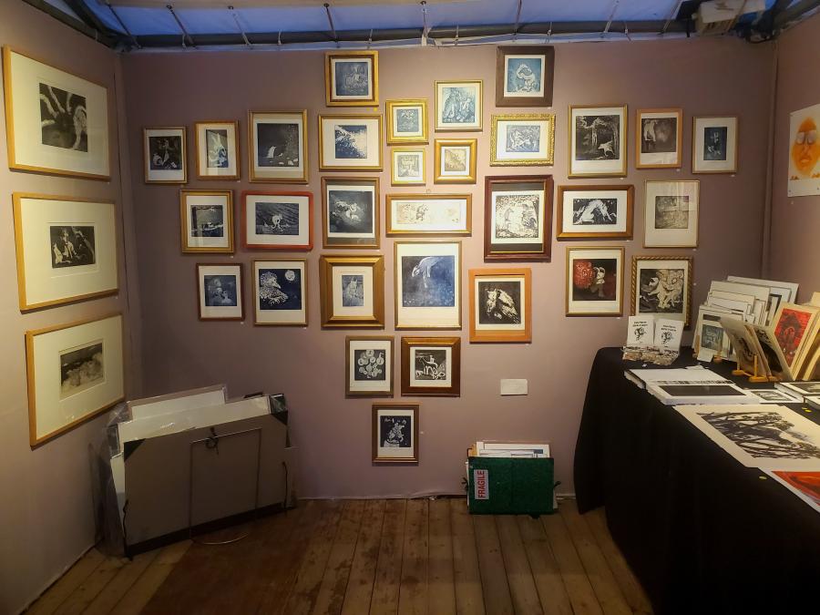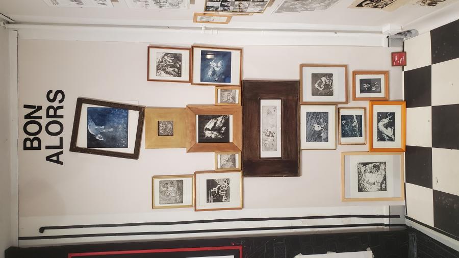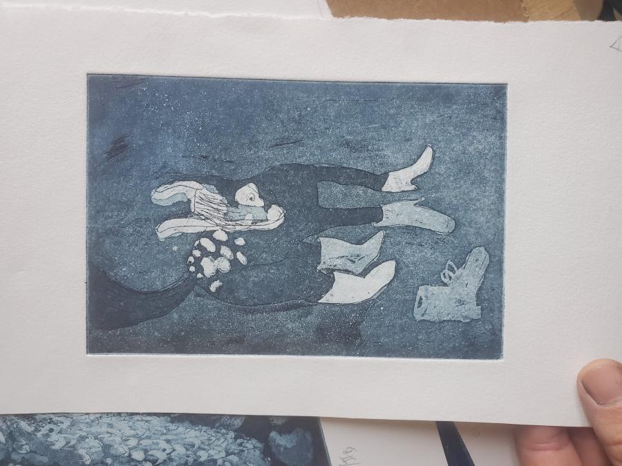 Pendant ce temps-là, le dessin et la gravure en sous-marin : hanter les cours du soir de Julie Giraud aux Beaux-Arts de Rennes, puis les cours de Francis Capdebosq à Paris, un stage avec Olivier Deprez à Bruxelles, participer à moult revues et fanzines collectifs, monter le magazine de bande dessinée KULBUT, imprimer des microfanzines déprimants, de la lino sur tissu, mordiller zinc et cuivre, et oser enfin exposer tout ça il y a assez peu de temps.