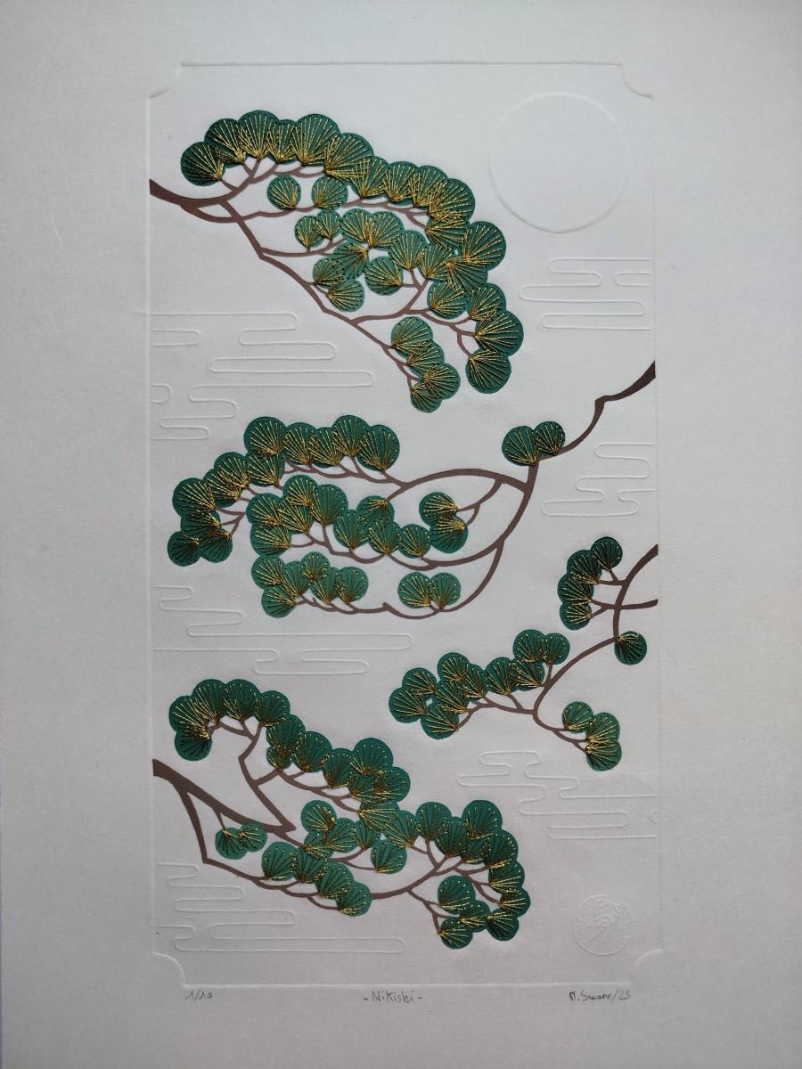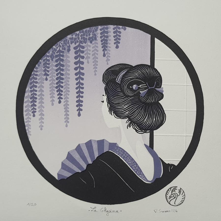 Sous le pseudonyme de Moïra Swann, je pratique la linogravure en premier lieu. Souvent polychromes, mes gravures incluent parfois de l'embossage, de la broderie et de la feuille d'or, pour atteindre un aspect plus tactile et poétique.