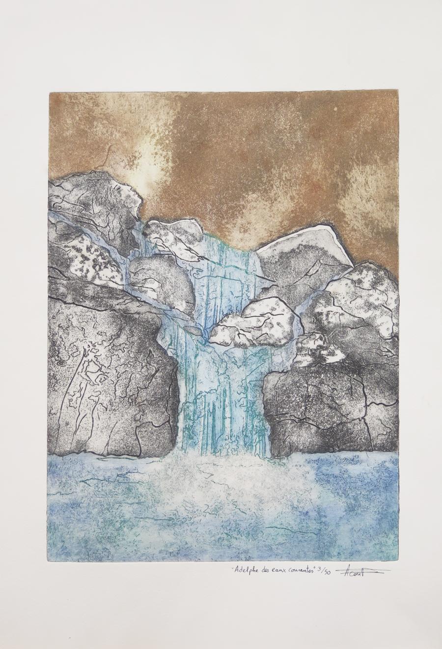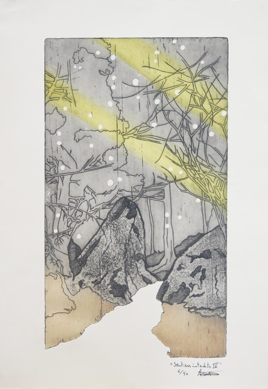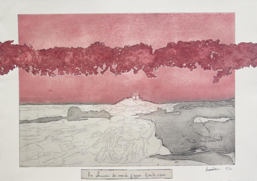 « Ma relation à la gravure est très personnelle. Je débute la création d’une future estampe avec l’idée de m’abandonner à la matière, une plaque de zinc vernie, où coup par coup, je gratte, j’enlève de la substance. Avant que l’image n’apparaisse l’acte de graver devient sonorité tangible, intérieure. J’écoute la pointe sèche gratter le vernis trait par trait. Par les tracés, l’image prends sa place. Le temps s’efface, je ne suis qu’avec la matière gravée. Les heures défilent, les contours se dessinent. L’horizon se crée. L’acide mords les lignes, gravant les courbes du paysages à jamais dans la mémoire. La gravure de l’estampe à l’eau-forte se crée au fil du temps. Puis l’encre s’infiltre doucement dans les interstices de la matrice métallique. Les couleurs nuancées redonnent vie au passé. Un élan de nostalgie donnant naissance à l’impression finale. »