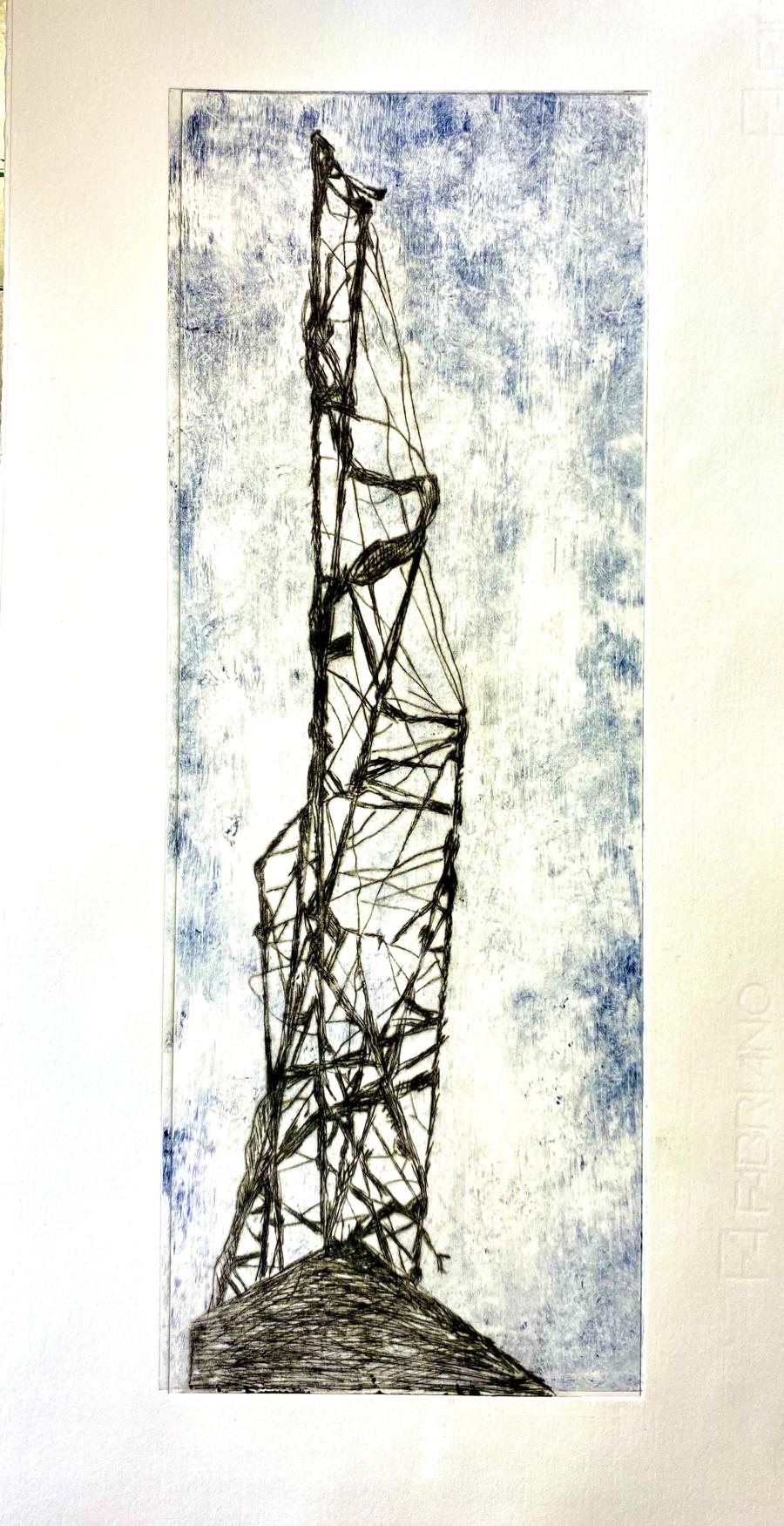Tour de l'ombre gravure pointe sèche rehaussée couleur bleue