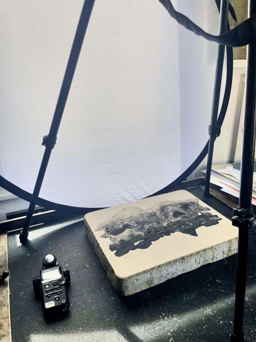 En lithographie lorsque l’on perçoit une forme ancienne d’un dessin sur une pierre qui a été grainé on peut parler de «Fantôme». La pierre garde en mémoire le dessin qui a été posé sur elle. il en est de même pour la science. Elle nous apprend également qu’il réside dans les pierres un nombre infini de détails sur le climat, la végétation, l’alimentation, le mode de vie des Hommes et des animaux... De nombreux restes microscopiques peuvent se retrouver piégés dans la calcite des spéléothèmes. Régulièrement je glane durant mes promenades quelques cailloux et autres pierres que je garde précieusement à l’atelier et qui constituent un fond de recherches pour mes créations. Cette collection provient de différents lieux, mais il faut dire que c’est la pierre volcanique de Lanzarote qui m’a inspirée mes premières lithographies et créations sur le sujet.