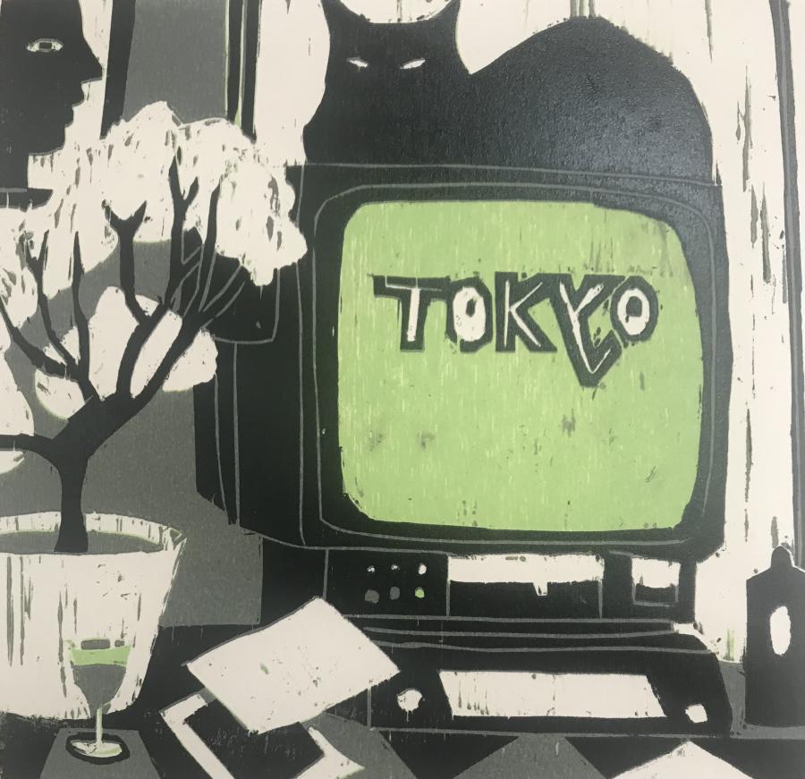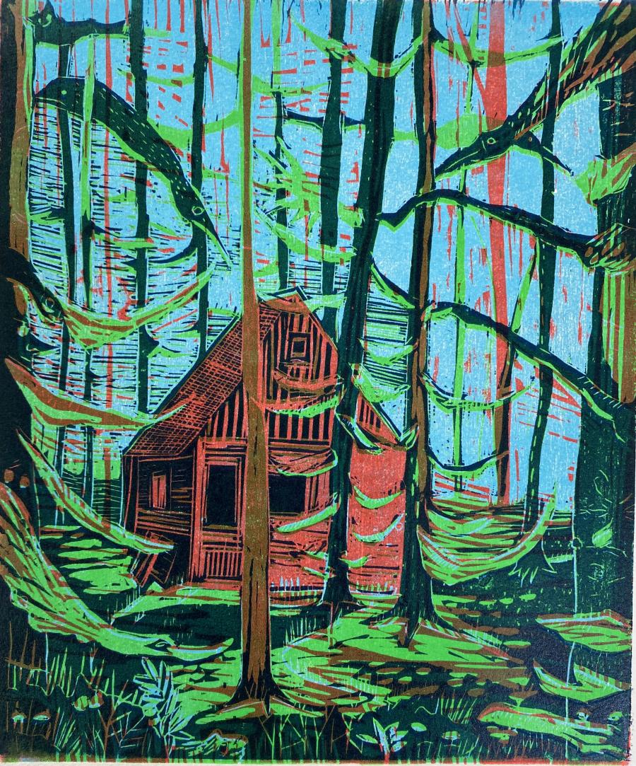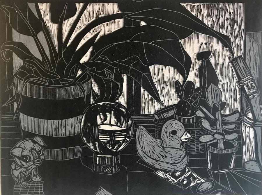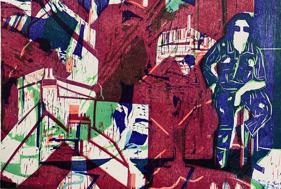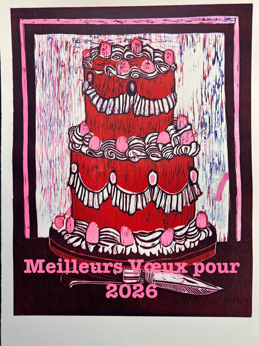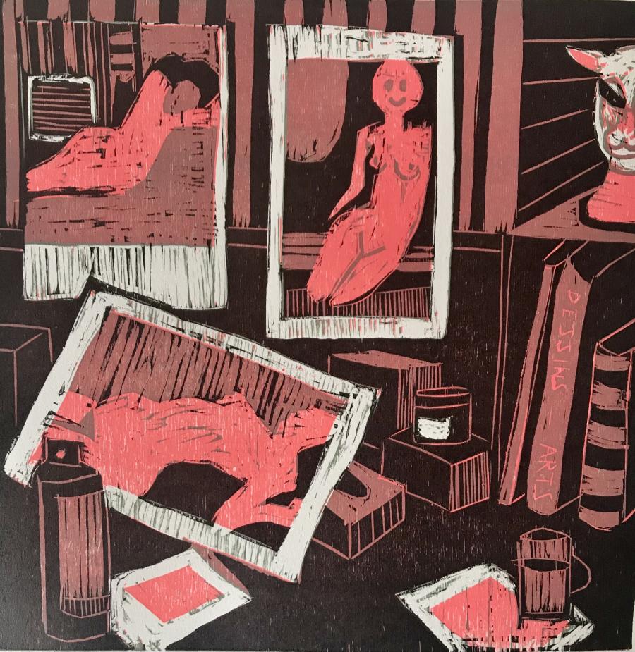 Pratique la xylographie, la lithographie et la gravure. Explore le champ de la couleur par le jeu de superpositions et de désencrage. Crée des estampes monumentales de jeux de lignes modulables en xylographie. Des intérieurs indiscrets avec des télévisions et des chats. Des flingues, des pièces montées avec couteau de cuisine. Des salons de coiffure saturés d’images de femmes. Des paysages instagramés. Des cabanes dans la forêt impressionnistes.