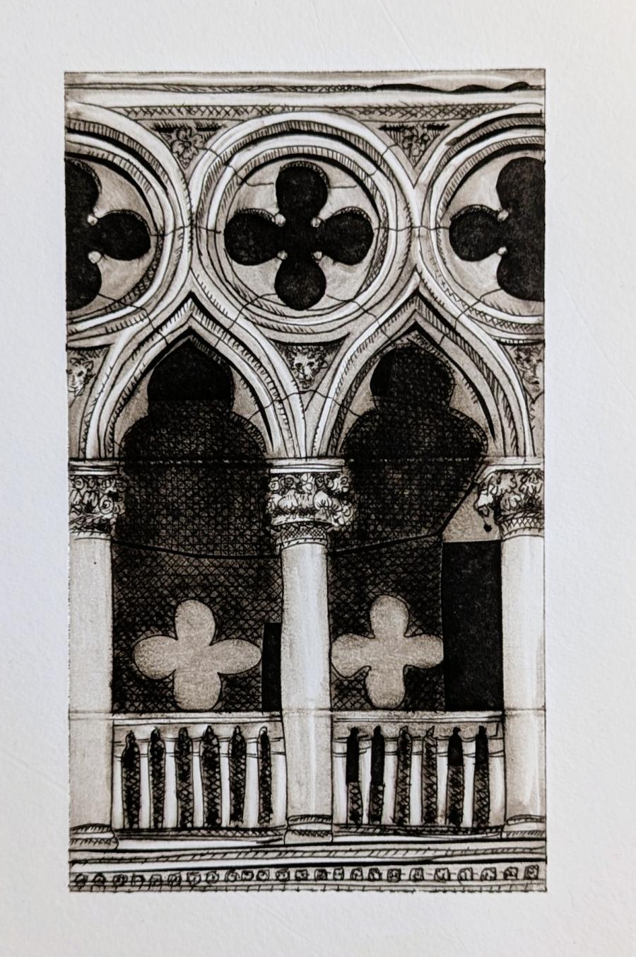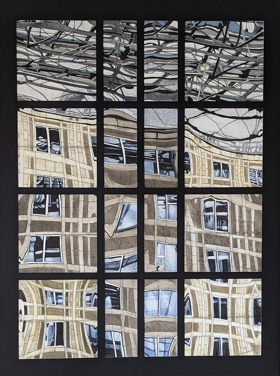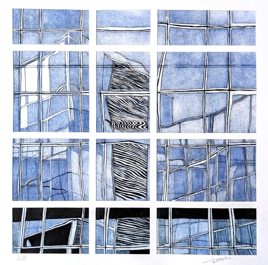 L’encrage, élément central de sa pratique, lui permet de modeler les ombres, d’accentuer les contrastes et de faire vibrer la matière avec une sensibilité particulière. Ses œuvres jouent ainsi sur la structure et la transparence, dans une quête d’équilibre entre rigueur formelle et poésie lumineuse.