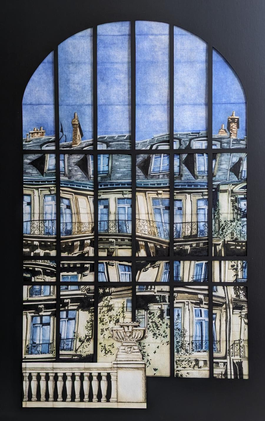 Son univers figuratif s’articule autour de compositions architecturales ,portes, fenêtres, jeux de reflets ,qui questionnent la frontière entre intérieur et extérieur.