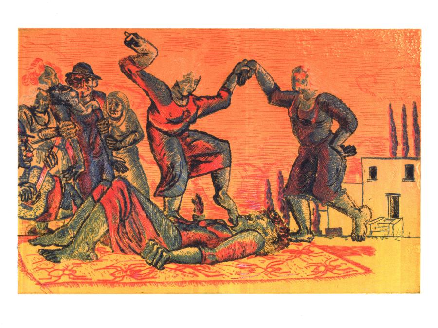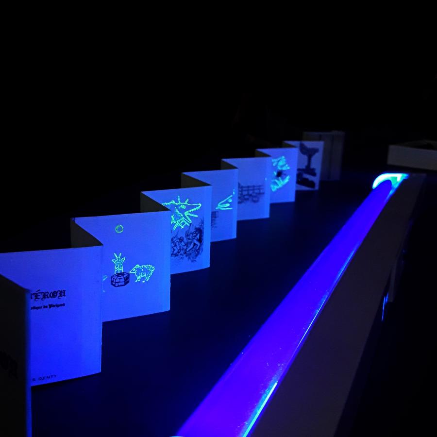 Autre histoire illustrée, cette fois sous la forme d'un leporello : le conte du lébérou, le loup-garou local. Louis grave douze petites illustrations au burin dans un livre d'art interactif, avec douze autres illustrations intégrées, cachées à l'encre phosphorescente, révélées à la lampe UV, pour trouver le Loup.