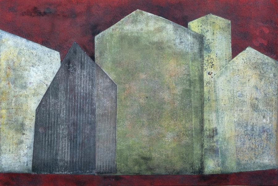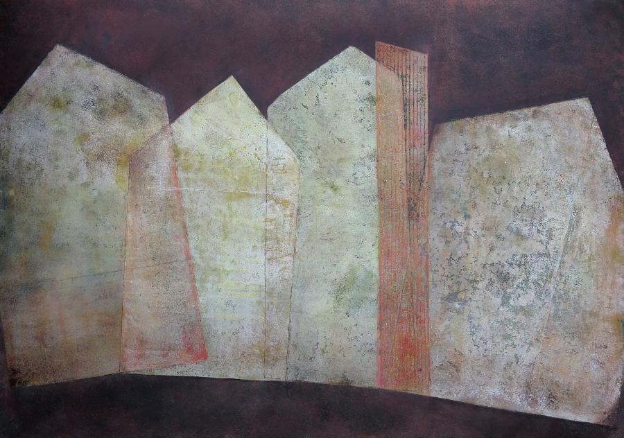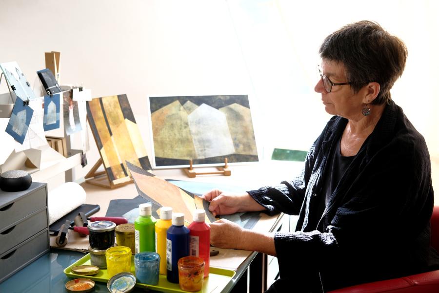 Née en 1958 en pays lorientais, vit et travaille en Centre Bretagne, Marie Thamin est une artiste qui a adapté la technique du monotype. Son travail se distingue par des compositions minimalistes qu'elle conçoit comme des moments d’apaisement, des formes simples qui évoquent des architectures urbaines ou rurales, souvent improbables, entre nature morte et paysage bâti. Ses œuvres jouent sur la transparence, la lumière et la matière, créant une ambiance contemplative. Elle utilise une palette chromatique riche en nuances, avec des couleurs subtiles, passées et écaillées.