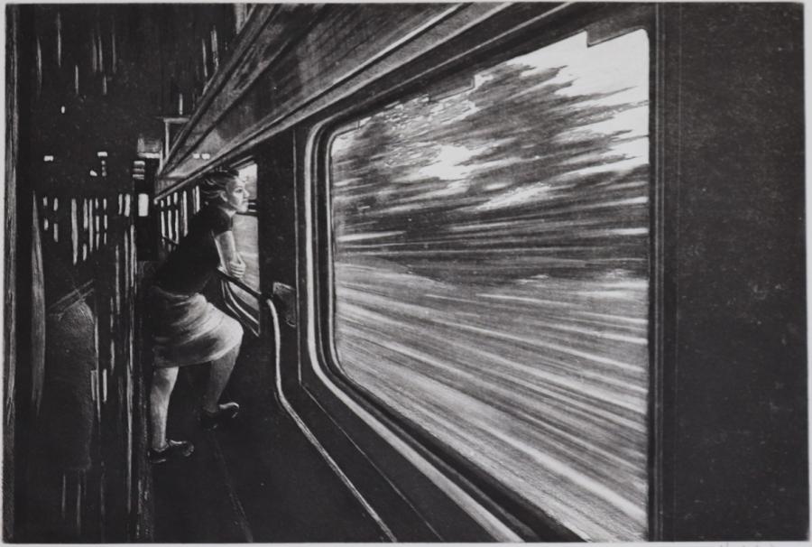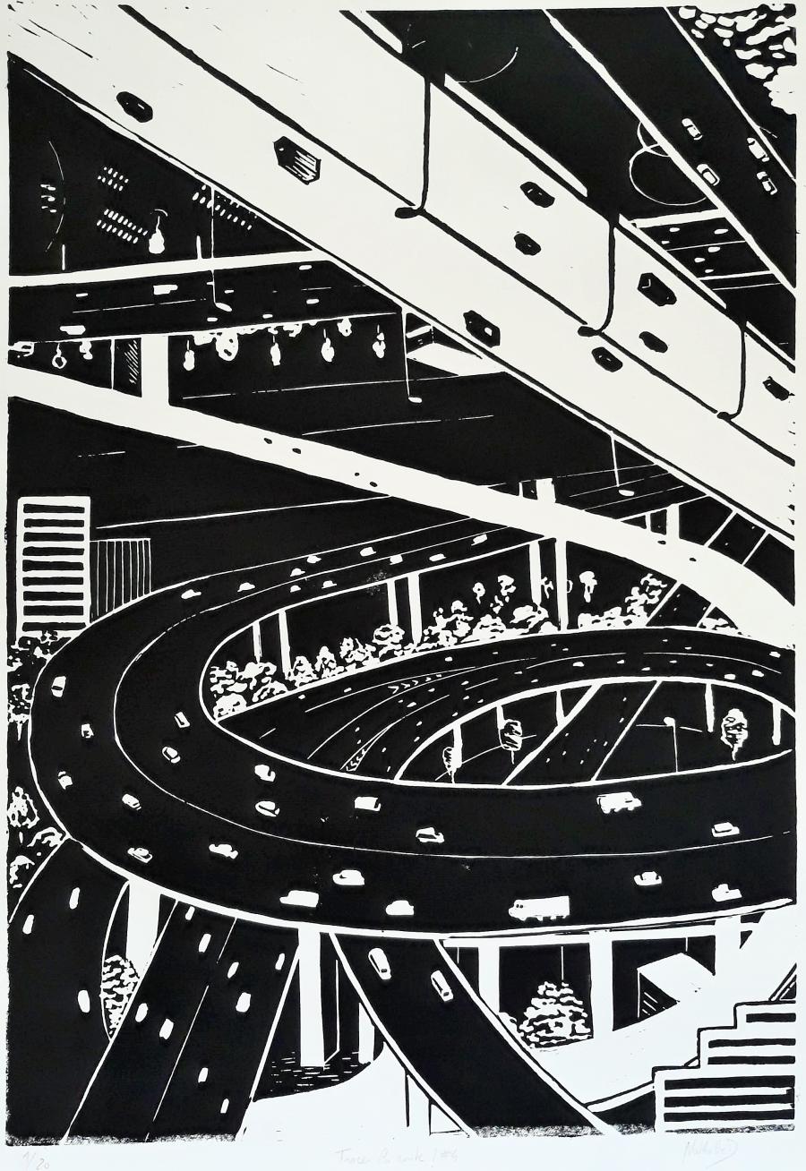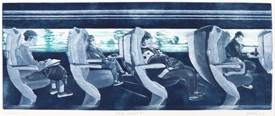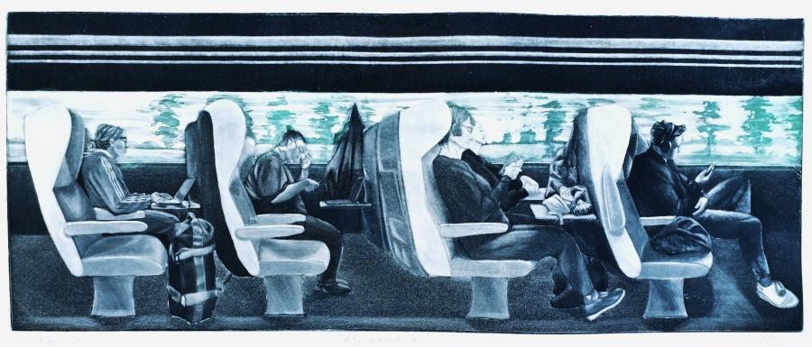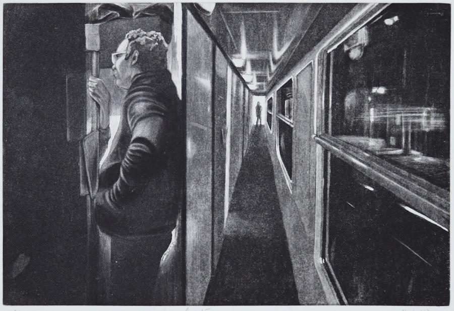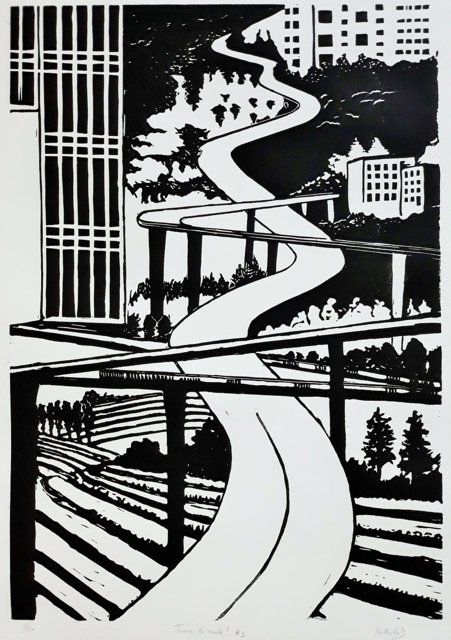 Ma démarche artistique questionne la condition terrestre, et notre vision du monde. Au travers de l’actualité, l’Histoire et les Sciences Humaines et Sociales, j’observe les déplacements de l’homme et l’incidence de ces derniers sur notre vision du monde. Mes précédentes peintures inspirées de l’homme dans les stations orbitales, je réinterprétais les genres picturaux sans la gravité terrestre. Dans mes gravures et mes peintures plus récentes, j’observe le comportement des voyageurs et les paysages façonnés par leur passage, aussi bien en voiture, en train ou à pied.