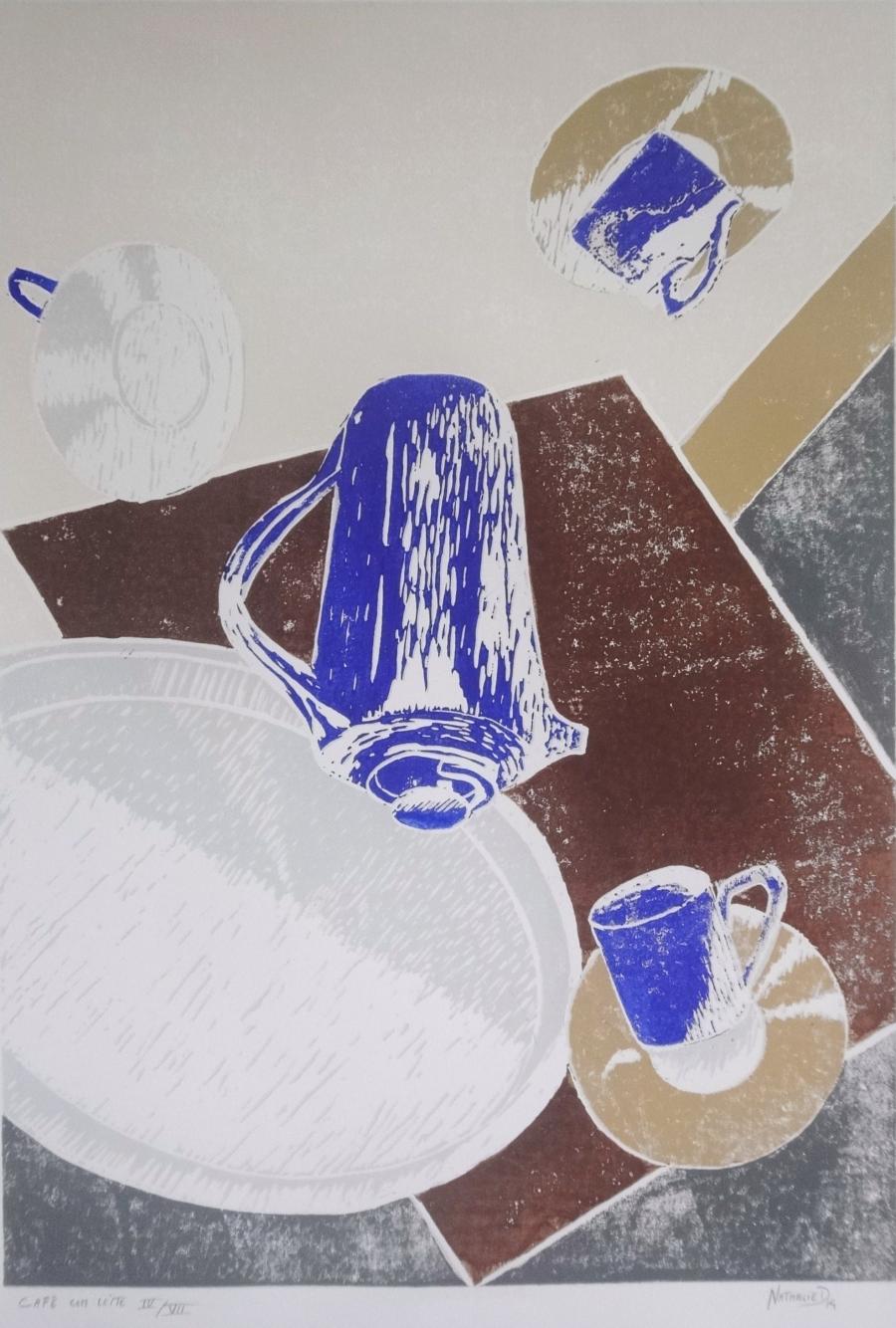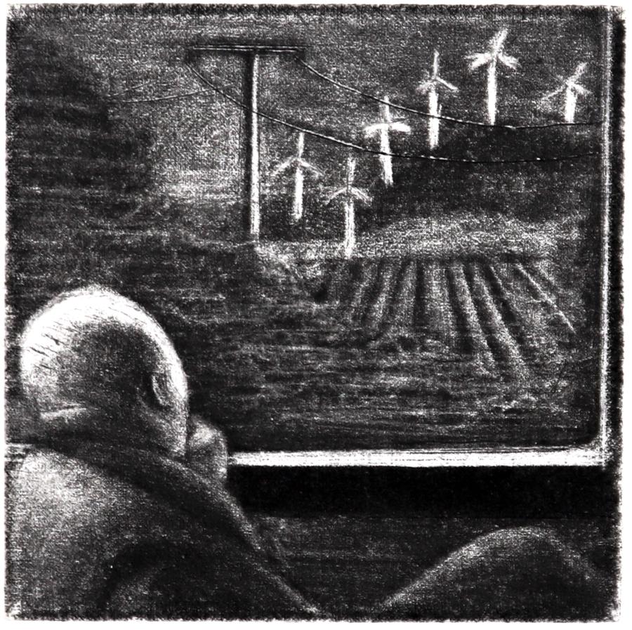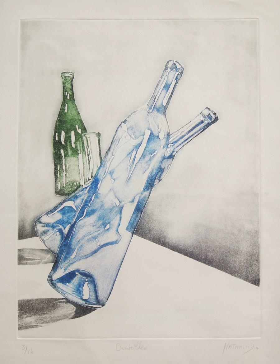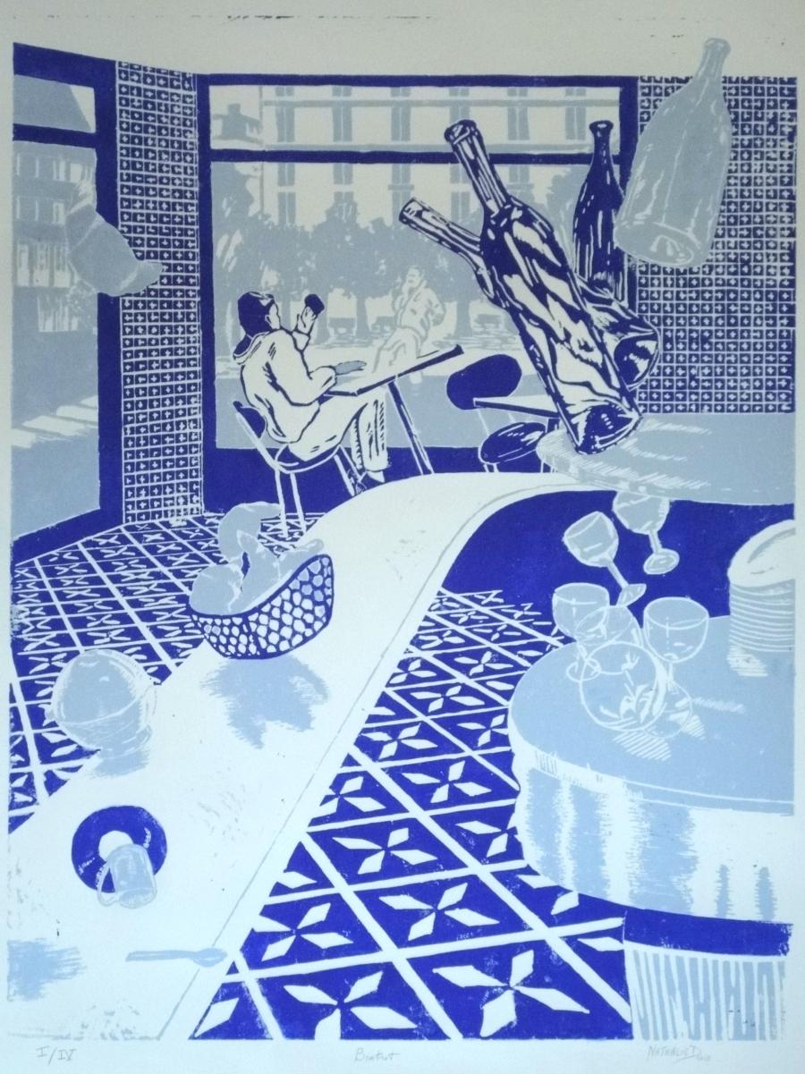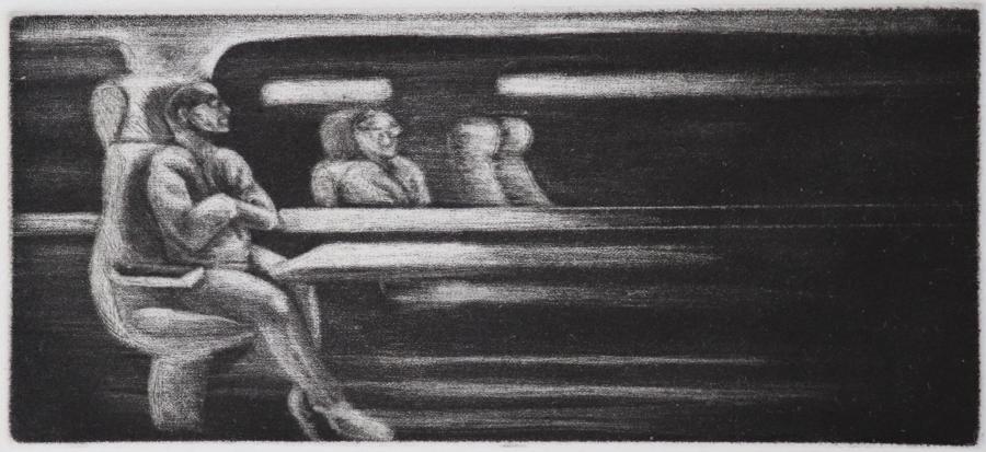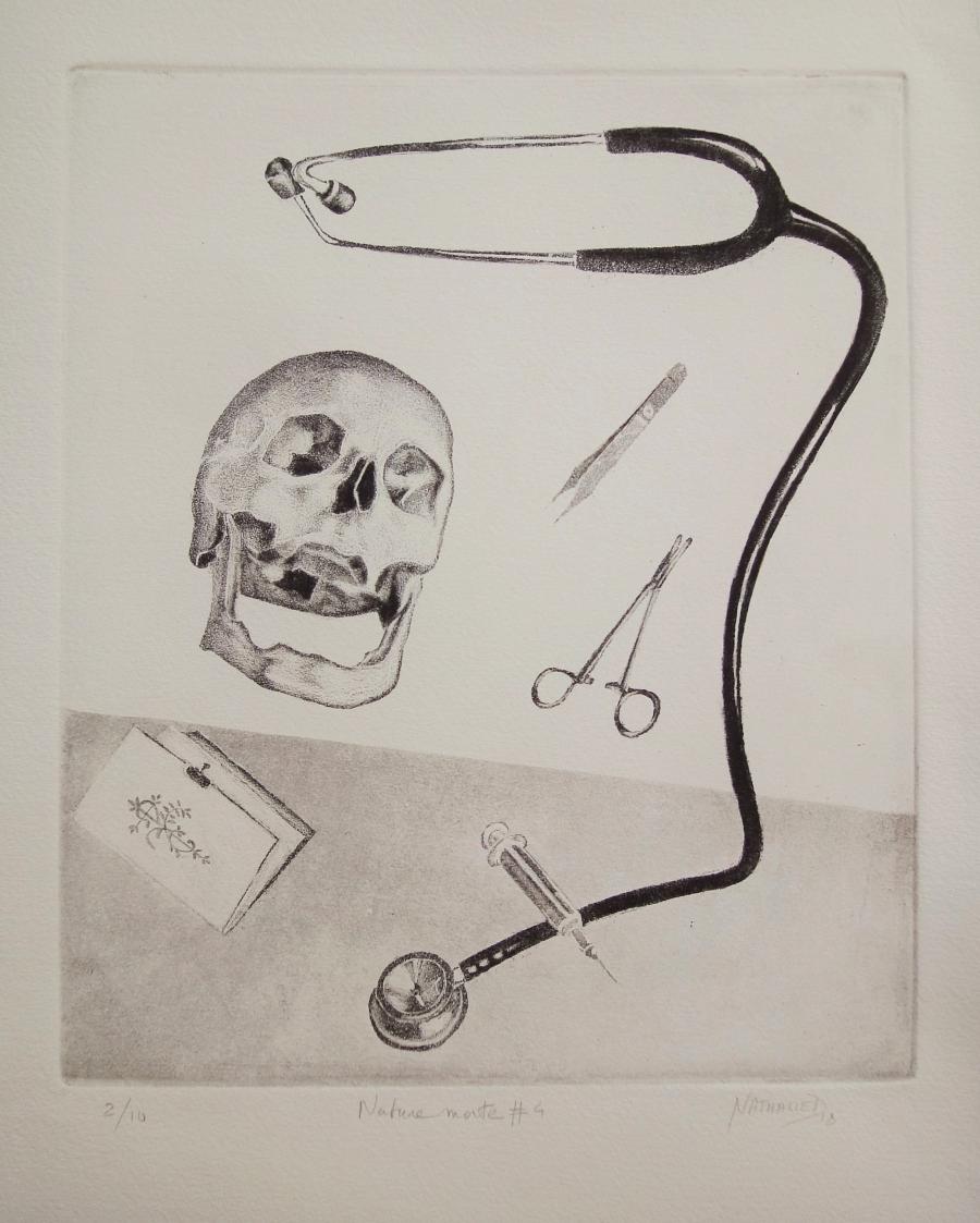 La gravure taille-douce est quant à elle, un corps à corps avec le métal, fait de patience et de rigueur. Je grave tantôt directement à la pointe sèche, grène le métal à la roulette ou au berceau, tantôt indirectement avec l’usage de l’aquatinte et du vernis dur et mou, creusant le métal par morsures dans l’acide. Je viens ensuite ouvrir des lumières, des transparences et des dégradés au brunissoir et au grattoir. Mes métaux de prédilection sont le cuivre et l’acier.